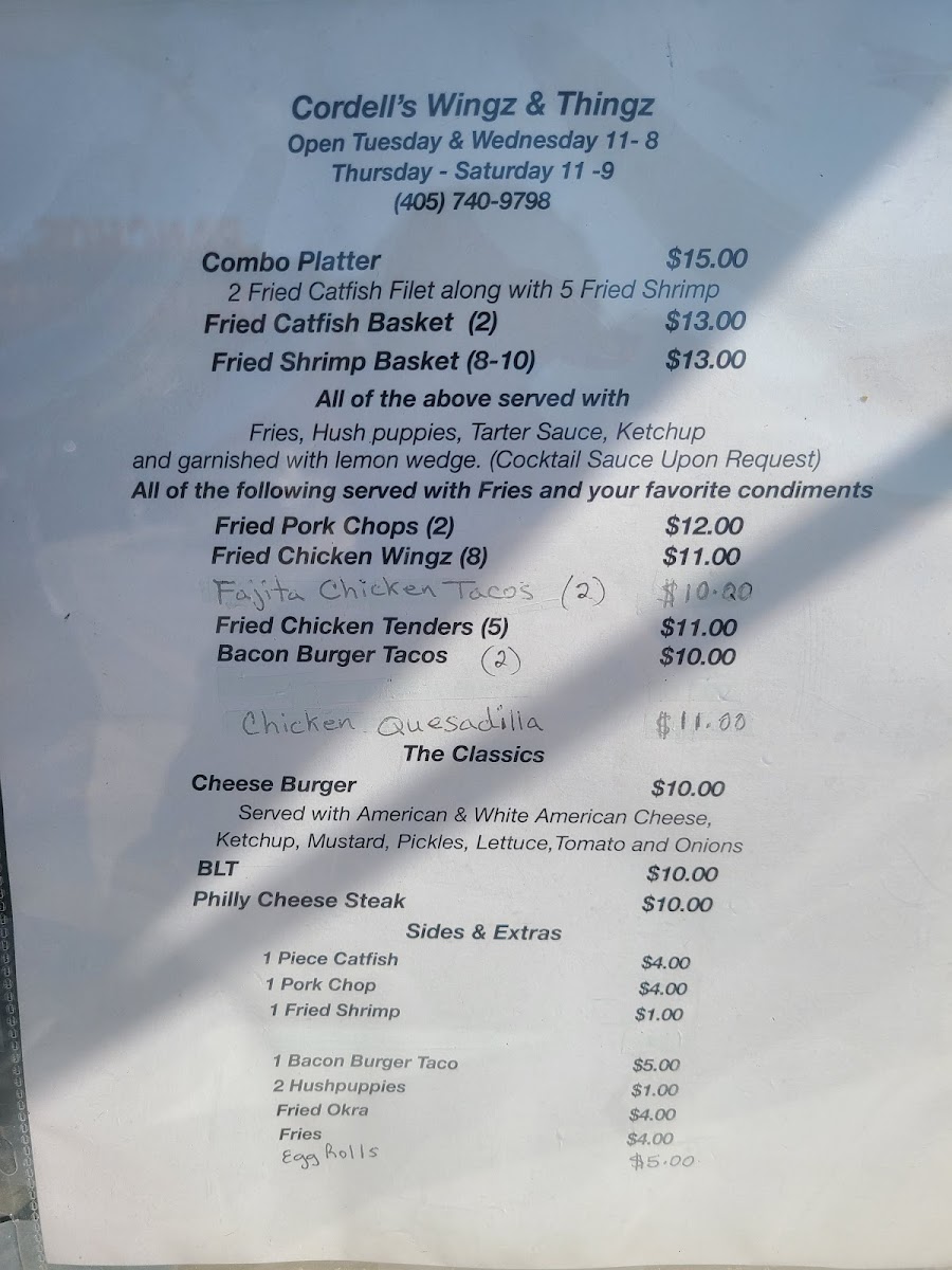 The menu at Cordell’s Wingz And Thangz brings together hearty comfort food and bold flavors, and after tasting through its highlights, it’s clear the kitchen focuses on crave-worthy favorites done right. The Shrimp Fried Rice stands out with its generous portion and savory seasoning, while the Fried Chicken Tenders (5) deliver satisfying crunch and tenderness. For something more playful, the Chicken Pickle Skewers and Crispy Chicken Tacos add fun twists to familiar classics, and the Fried Catfish Basket (2) offers a well-fried, flavorful seafood option. Among “The Classics,” the Spicy Pickle Chips provide a zesty starter, and the Chicken Caesar Salad brings a lighter choice without sacrificing taste. Heartier options like the BLT, Philly Cheese Steak, and Cheese Burger round out the lineup with reliable, comforting bites. Even the sides feel indulgent, with the Loaded Cheese Fries serving as a rich, satisfying add-on. Altogether, the menu balances variety and comfort, making it easy to find something that hits the spot.